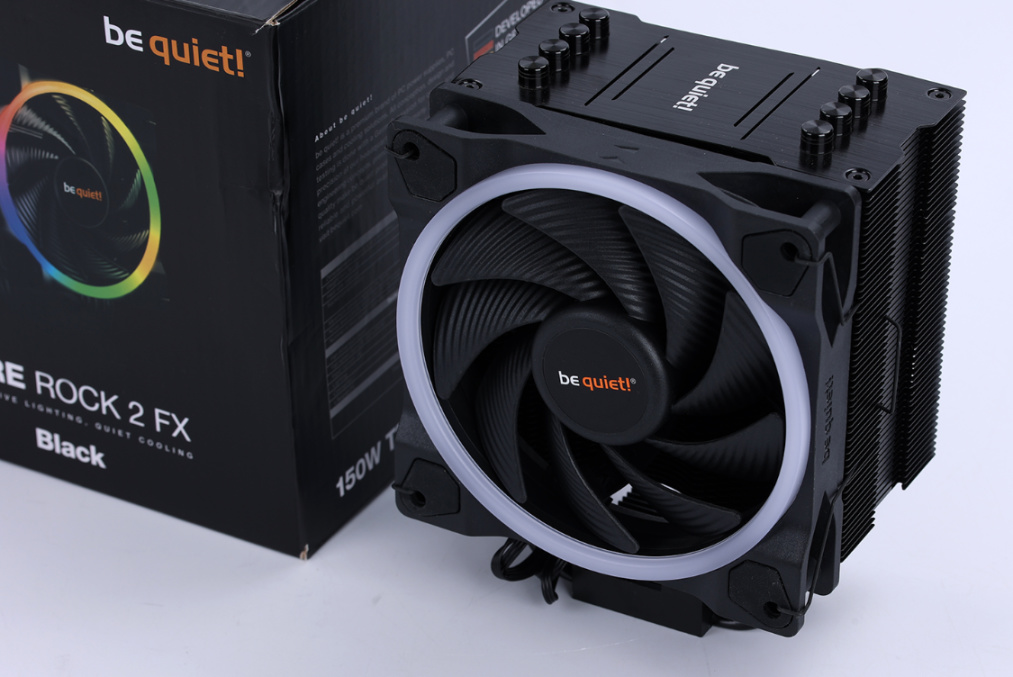 散熱咱當初用的也是德商德靜界旗下的PURE ROCK 2 FX風冷。單塔設計,純黑配色,塔體表面採用了黑色陶瓷塗層,在保證散熱器散熱效率的同時,還能提高散熱器的耐用性。非對稱結構的熱管偏置設計,“歪脖子”的熱管造型,對高馬甲內存安裝也非常友好。