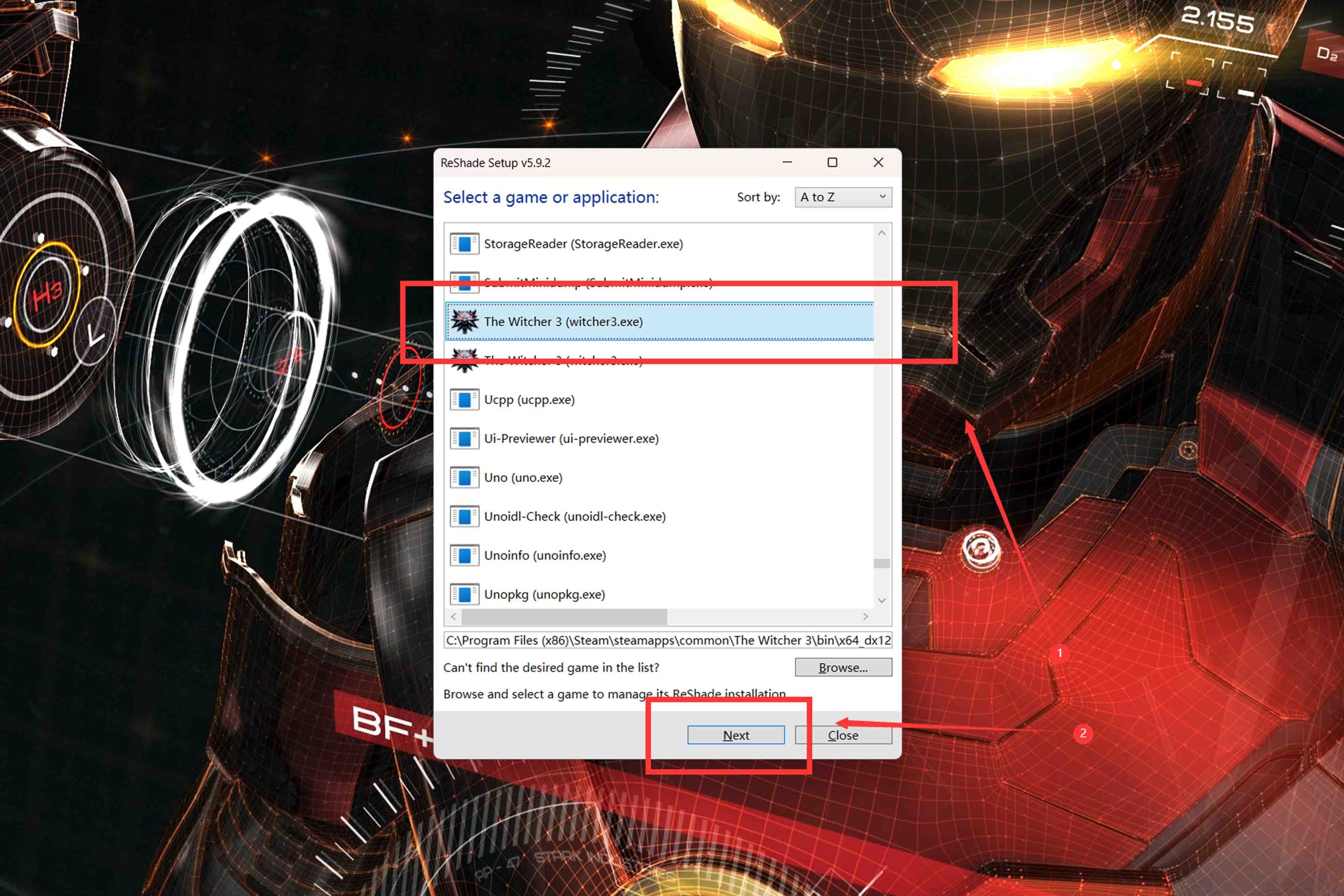 下载完安装包后双击打开,第一步先选择需要开启Reshade的游戏,一般会自动搜索出来,如果没有可以点击下方的browse手动选择,切记选.exe结尾的程序文件,不是快捷方式。