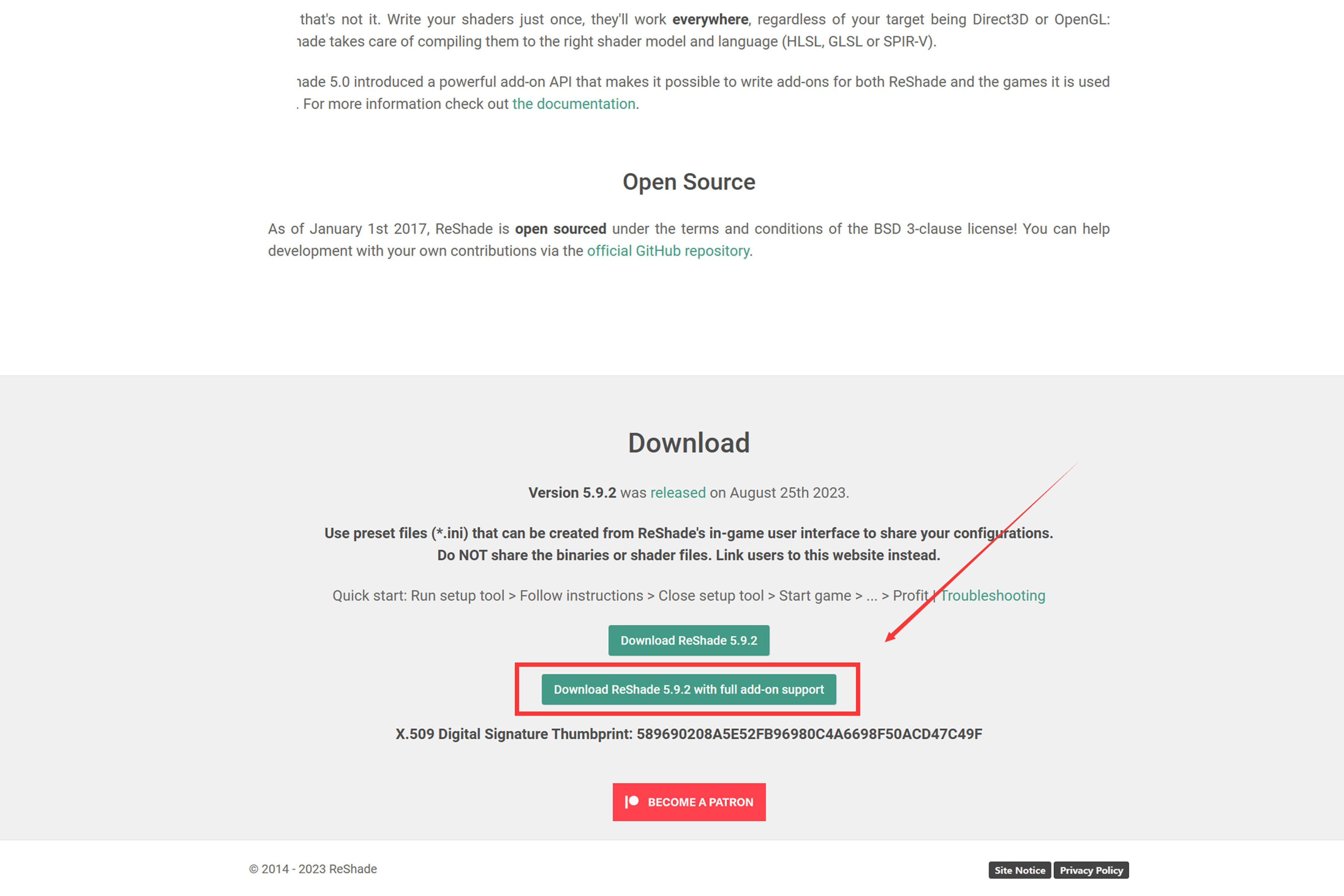 首先先去官网下载最新版本的Reshade安装包,记得选Full Add-on(全插件版本):
