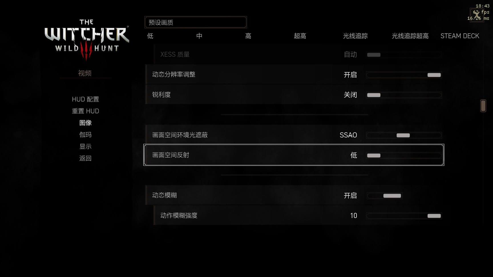 既然画面优化交给Reshade,游戏本身设置就没那么重要了,保证FPS尽量与显示器刷新率匹配就行,常规游戏都有几档默认预设,提升帧数的关键配置如下: