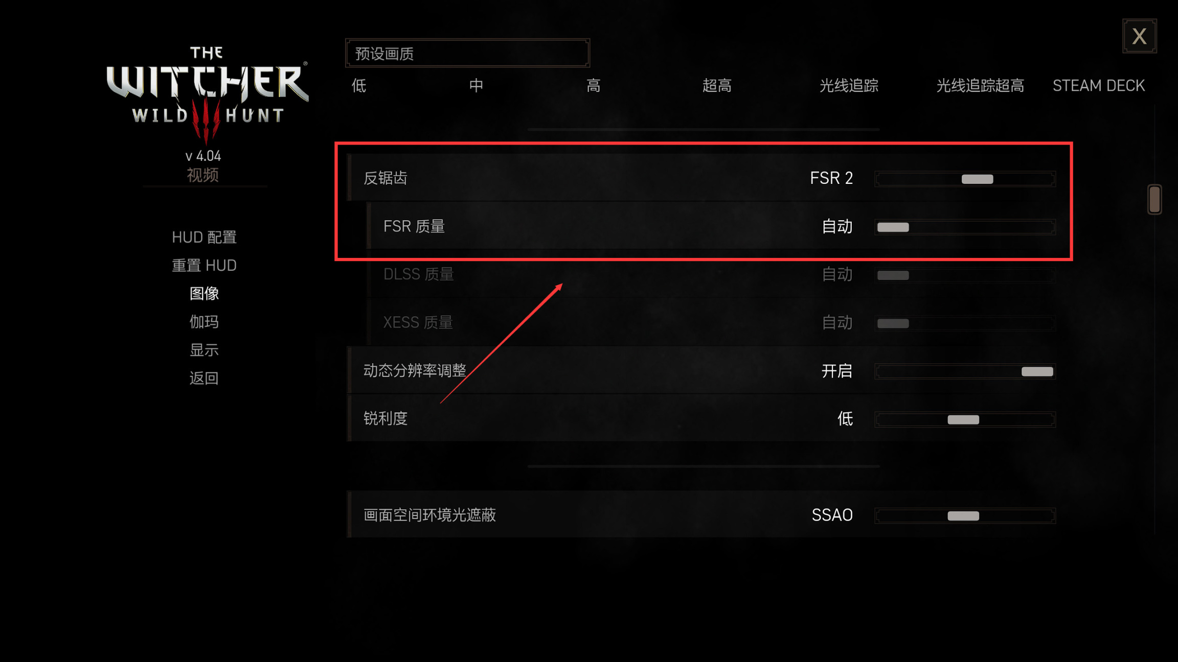 ● 默认预设选择最低,FSR开启并切换成超高性能,同时关闭锐利度。