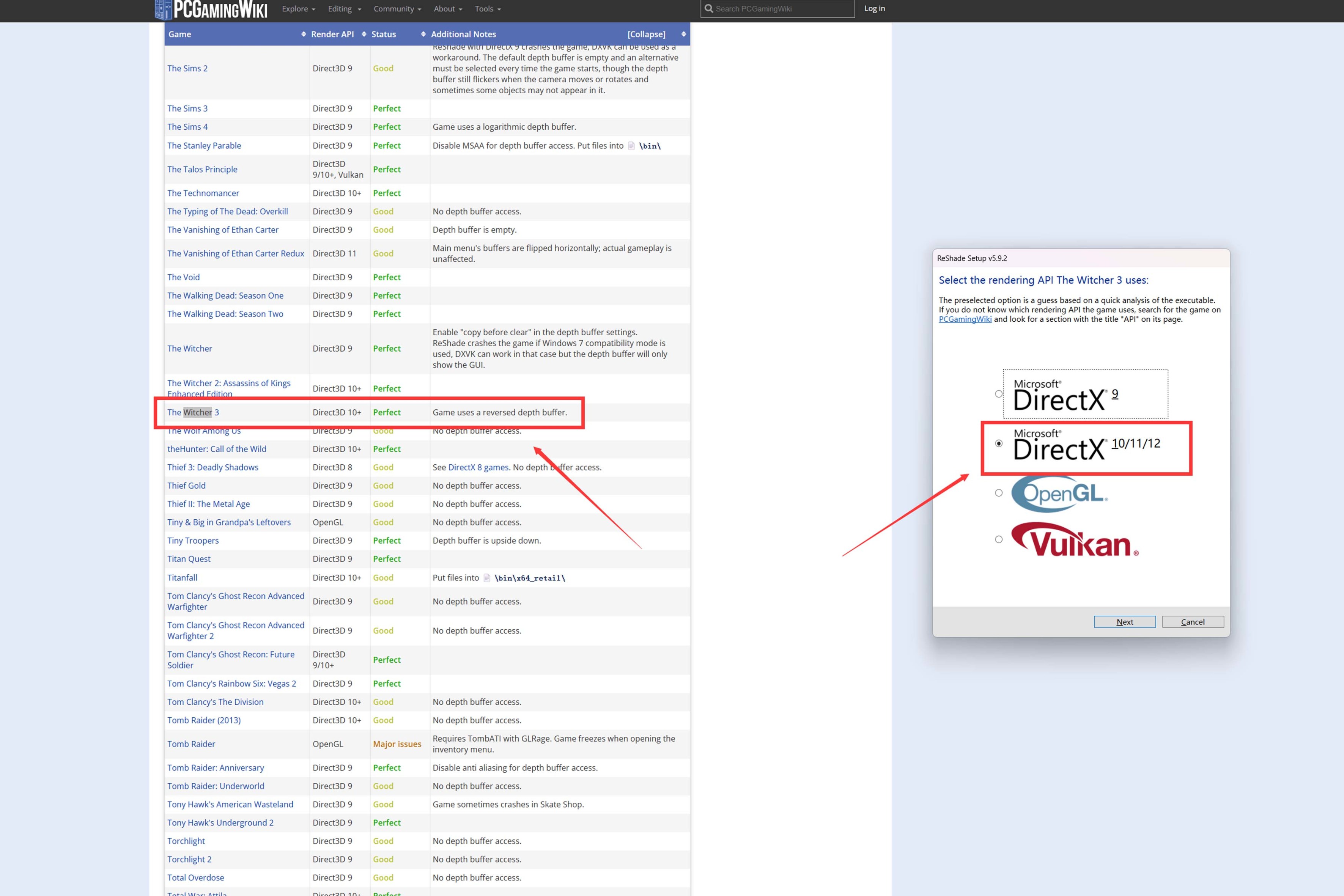 第二步选择游戏接口,有DX9、DX10/11/12、OpenGL和Vulkan可选,不清楚想玩的游戏选啥就去下面的官方表里面查一下,这里巫师3重制版选第二个DX12: