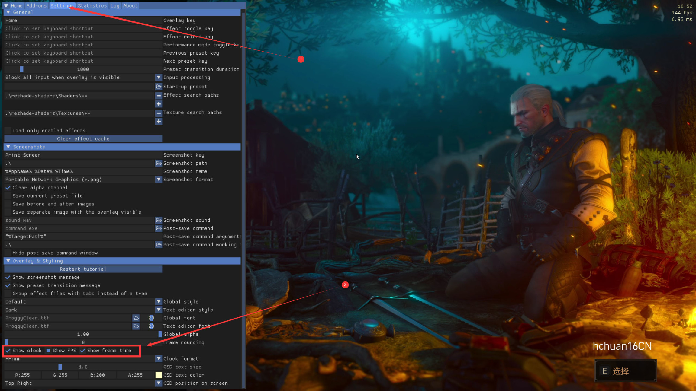 除了修改画面特效以外,Reshade还可以显示当前时间、游戏当前帧数和刷新时间,点击设置栏的Setting,勾选上Show Clock、FPS和Frame time即可即时生效。