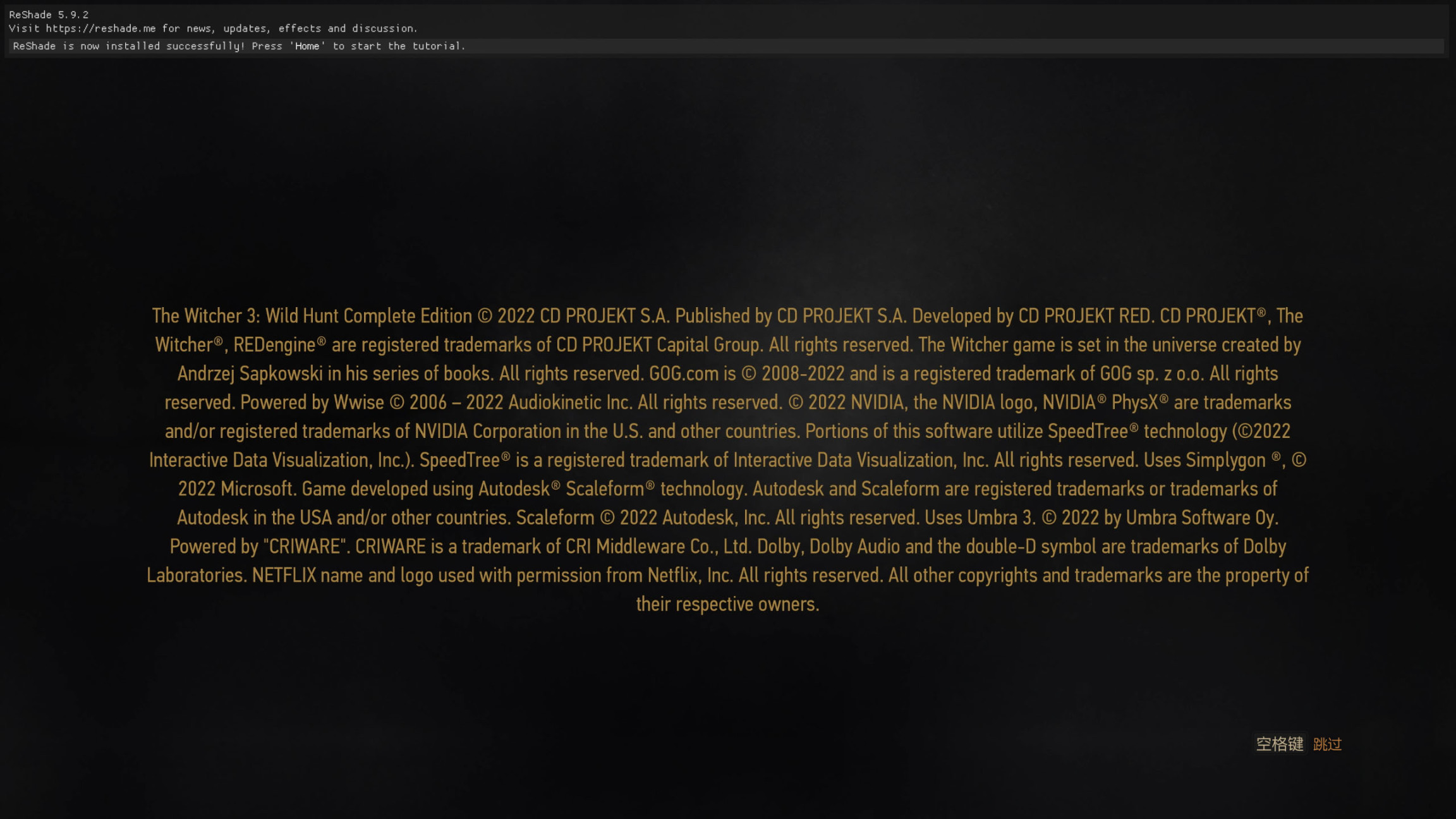 完成上述安装操作后开启游戏,游戏左上角会提示Reshade安装成功。首次打开时加载可能会慢一点,请耐心等待,加载完成后按Home进入Reshade的配置教程。