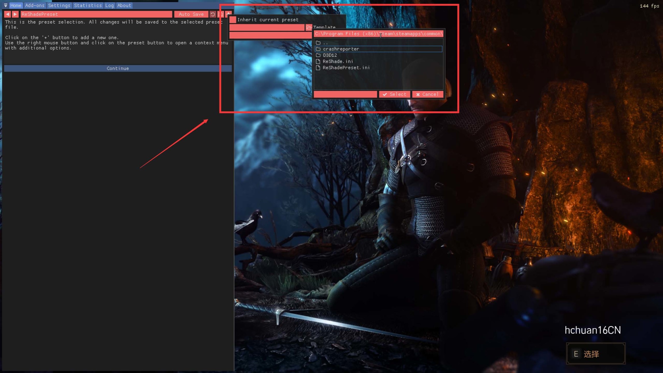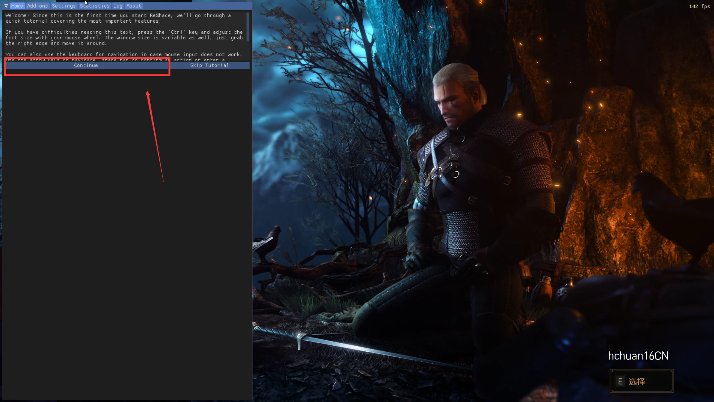 Reshade控制台默认在画面左侧显示,先点击Continue继续。
