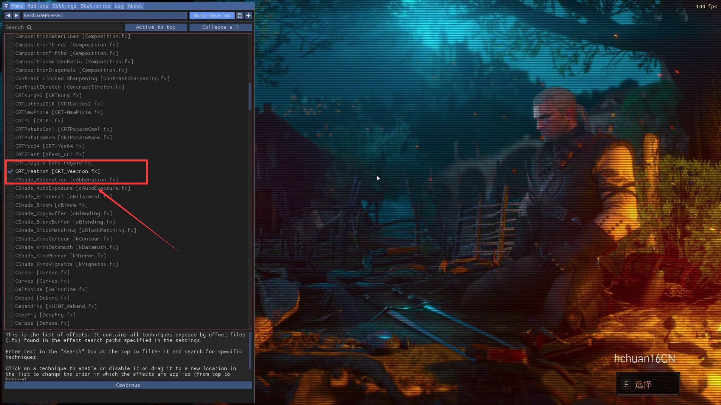 第二步选择需要开启的特效,在这个页面直接勾选特效即可生效,比如这里我勾选上了CRT_Yeetron.fx,效果如下图所示,整体画面就多出了类似老式显示的波纹效果。
