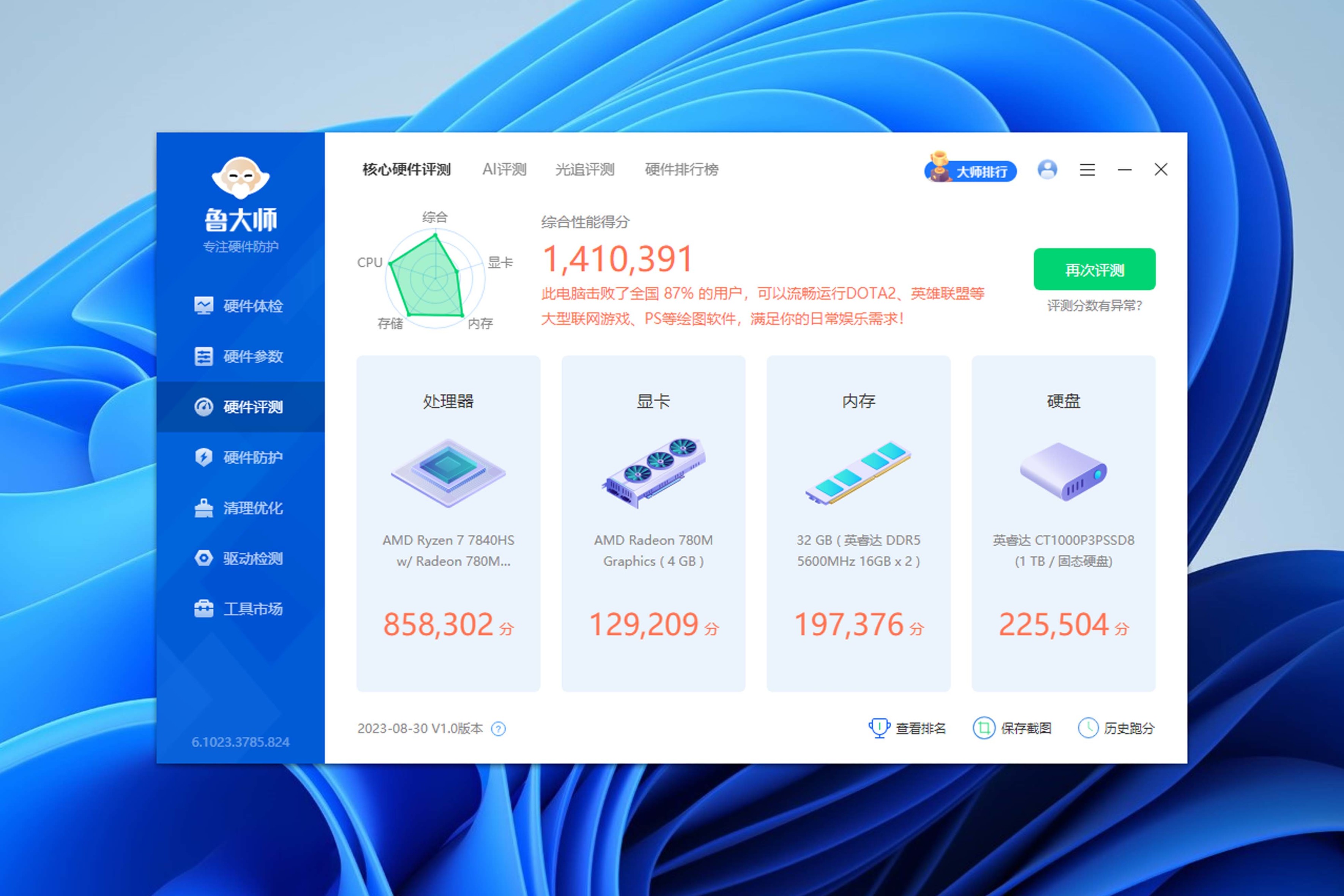 这次演示使用目前迷你主机中算旗舰配置的零刻SER7,CPU为AMD 7850HS,鲁大师跑分如下图所示,全新的散热设计效果不错,价格也不算贵得离谱,入手当游戏主机问题不大。