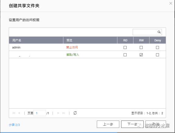 这里配置文件夹权限,勾选自己的账户,rw表示可以读写;ro表示只能读取不能写入;deny表示禁止访问,看都不给看。