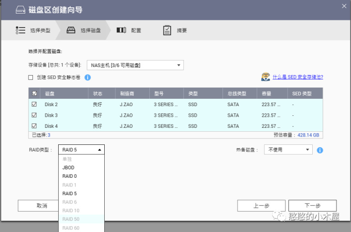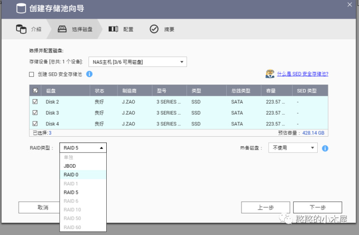 敲黑板,威联通有个存储池的概念,会在软raid阵列上建立一个池,拥有快照等功能,但是会占用一定的额外空间且性能也会降低,在这里点新建存储池则是新建一个软raid阵列并且在这个阵列上建立一个池,可以简单理解成在一个硬盘上建立一个存储空间,以后所有的文件都放在这个空间里,这样会导致就导致性能会降低,但是可以使用快照等功能,取舍就需要自己定夺了。