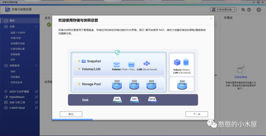 登录到nas后打开存储与快照总管,第一次打开会有欢迎界面,写的很简单可以不用看。