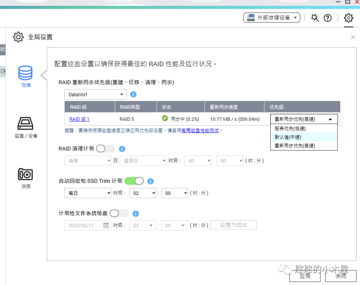 若是觉得同步raid速度太慢,可以到设置中更改为重新同步优先。