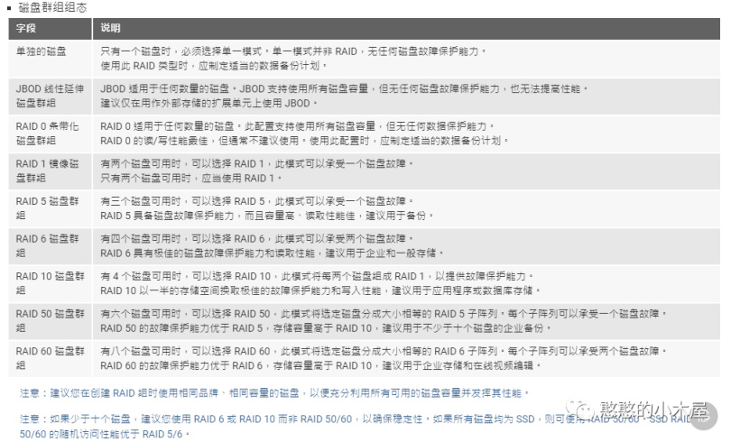 这一步是配置raid阵列类型,不同raid类型可用空间、性能、冗余等均不一样请注意谨慎选择,当然也可以不做raid,每个盘单独使用也可以,或者做jbod都可以,具体请看下图中不同类型的介绍。