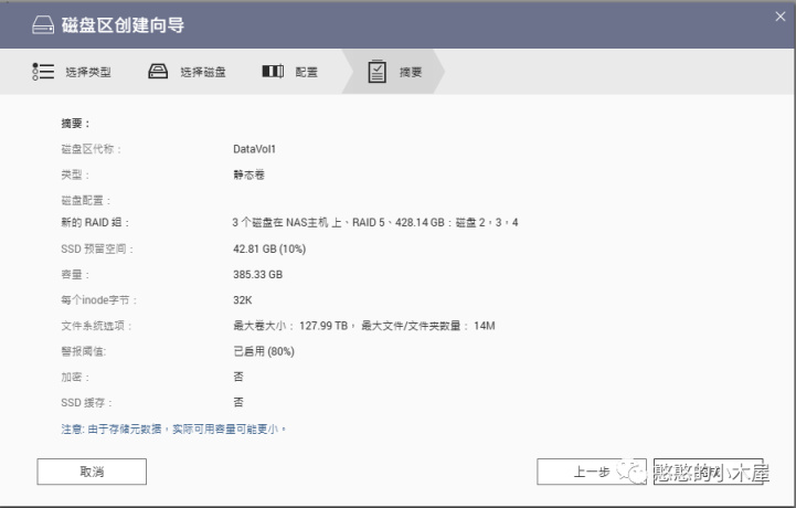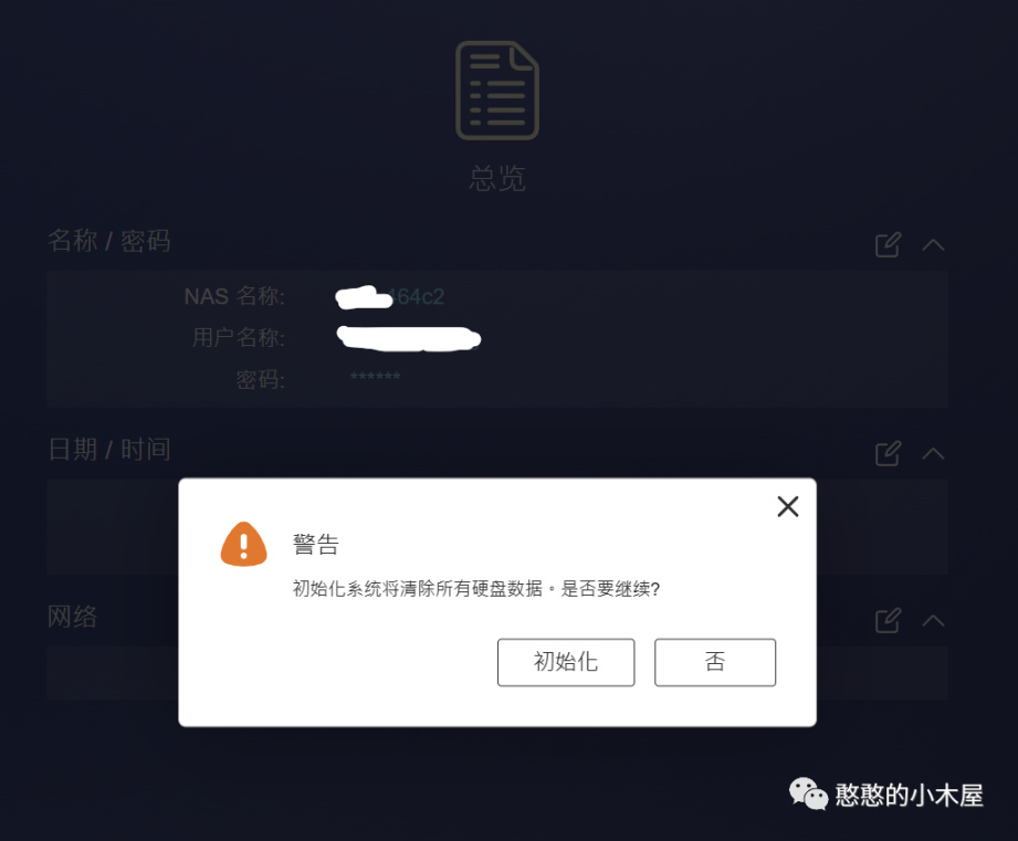 这里可以看到全部配置的信息,点击完成会提示需要初始化硬盘,如果插入的是旧的硬盘请提前确认数据已备份。