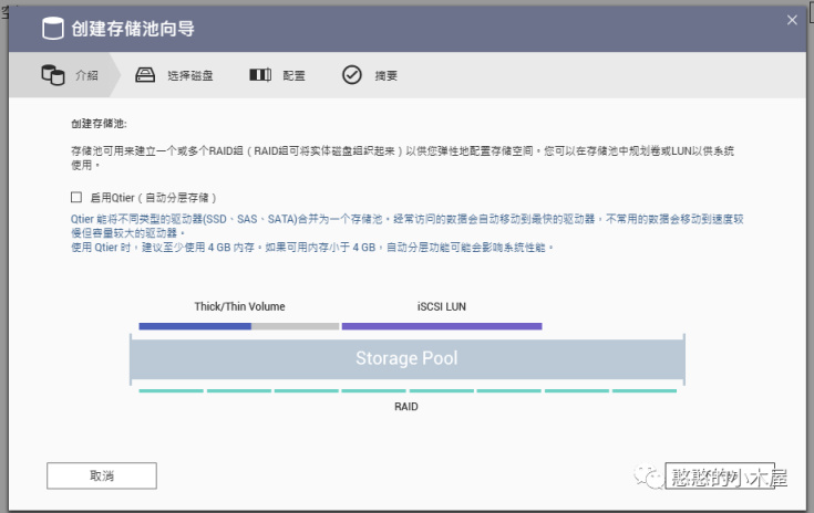 也可以一开始直接建立存储池,这里会有一个qtier分层存储的功能,就是把ssd和hhd混合做一个大的存储池,系统会把经常要用的放到ssd里面,不常用的文件放到hdd,提醒,这种存储方式ssd/hdd任何一方出现故障都会导致数据丢失,而且一旦启用想关闭也是有点麻烦,如果没有特殊需求建议不要启用。