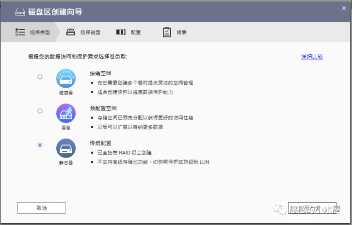 重要提醒:精简卷和厚卷不是标准raid阵列,数据是存储在raid阵列上的存储池中,一旦需要做硬盘数据恢复,大概率是恢复不了的,且一旦选定卷类型则无法改变。