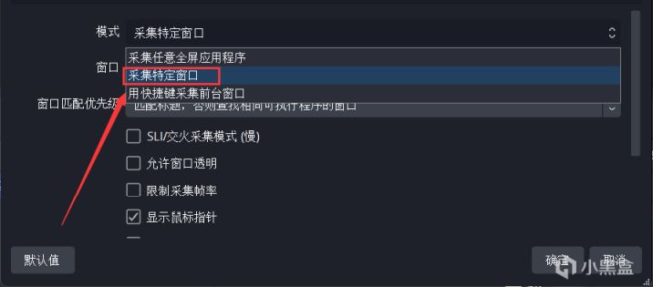 点击刚刚添加的游戏源,模式选择采集特定窗口