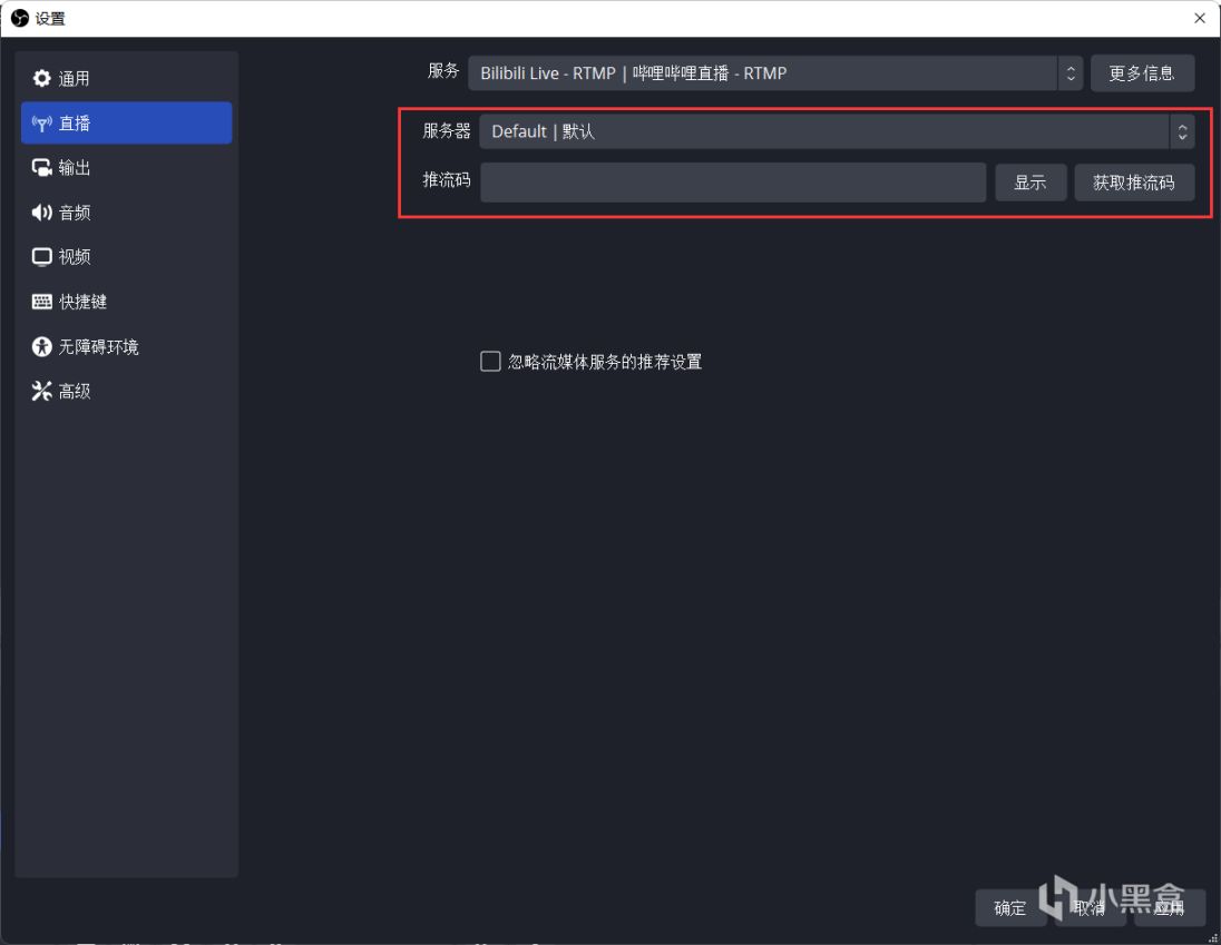 比如在B站直播时,我们选择第三方推流,得到服务器和推流吗