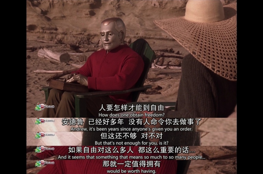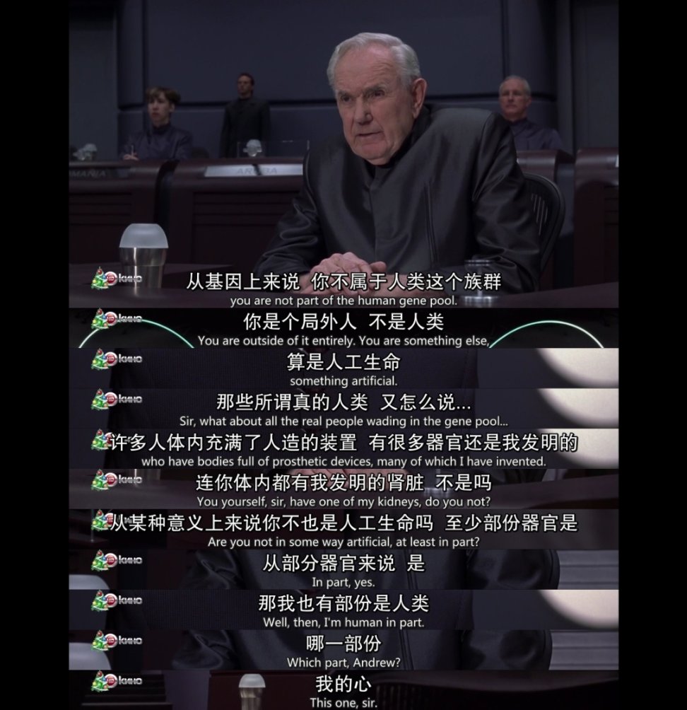 安德魯選擇“變人”,是想通過放棄自己機械不老身的自我犧牲方式以求得一種平等和認同。而不是電影中爲了愛情奮不顧身,感人嗎?很感人,如果沒有前面一個多小時的鋪墊,也許這部電影很成功,但是前面那麼大量對於自由的追求和自我認同的描摹被後面爲了所謂的愛情而被全部拋棄真的讓我無法接受。
