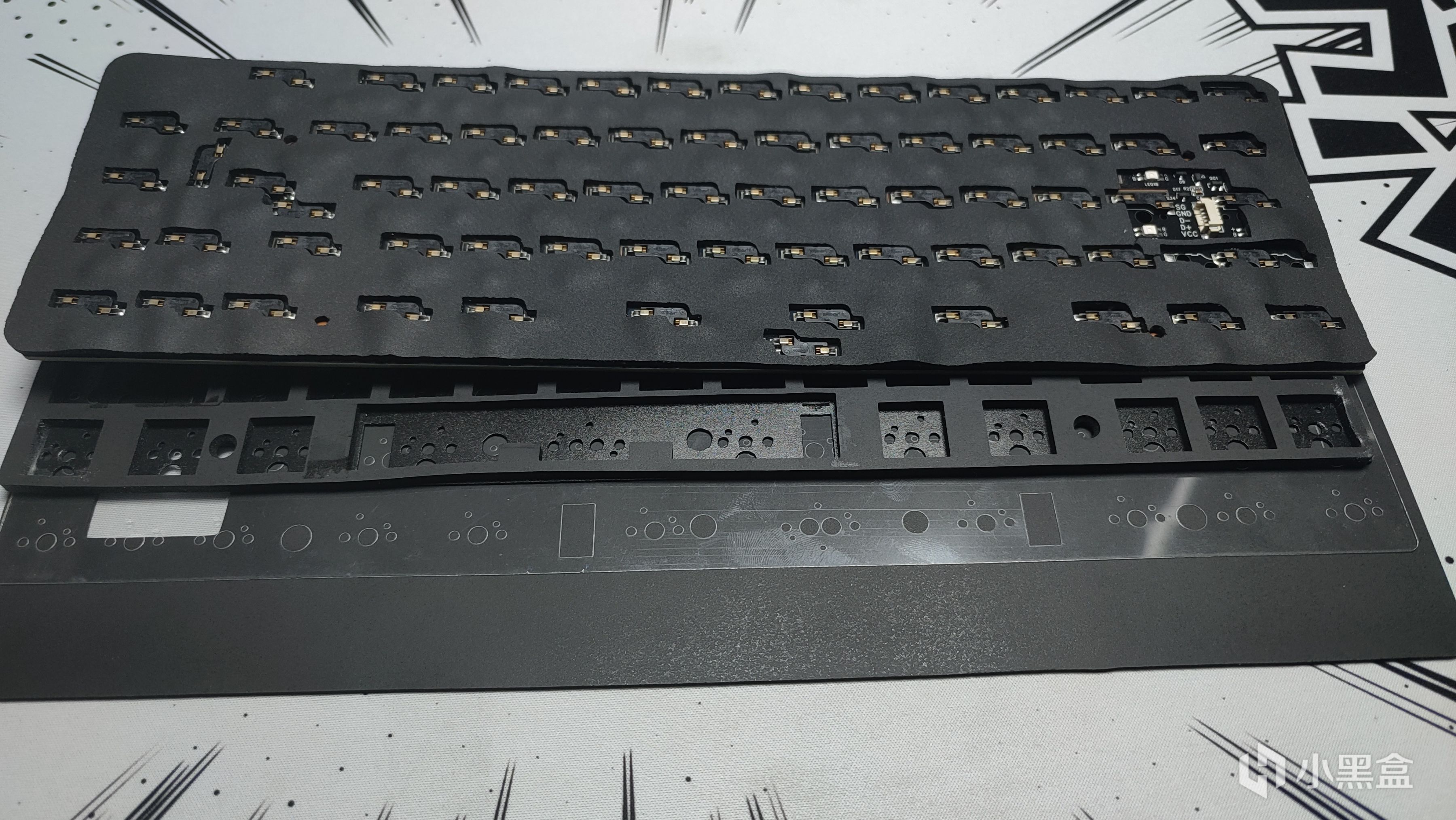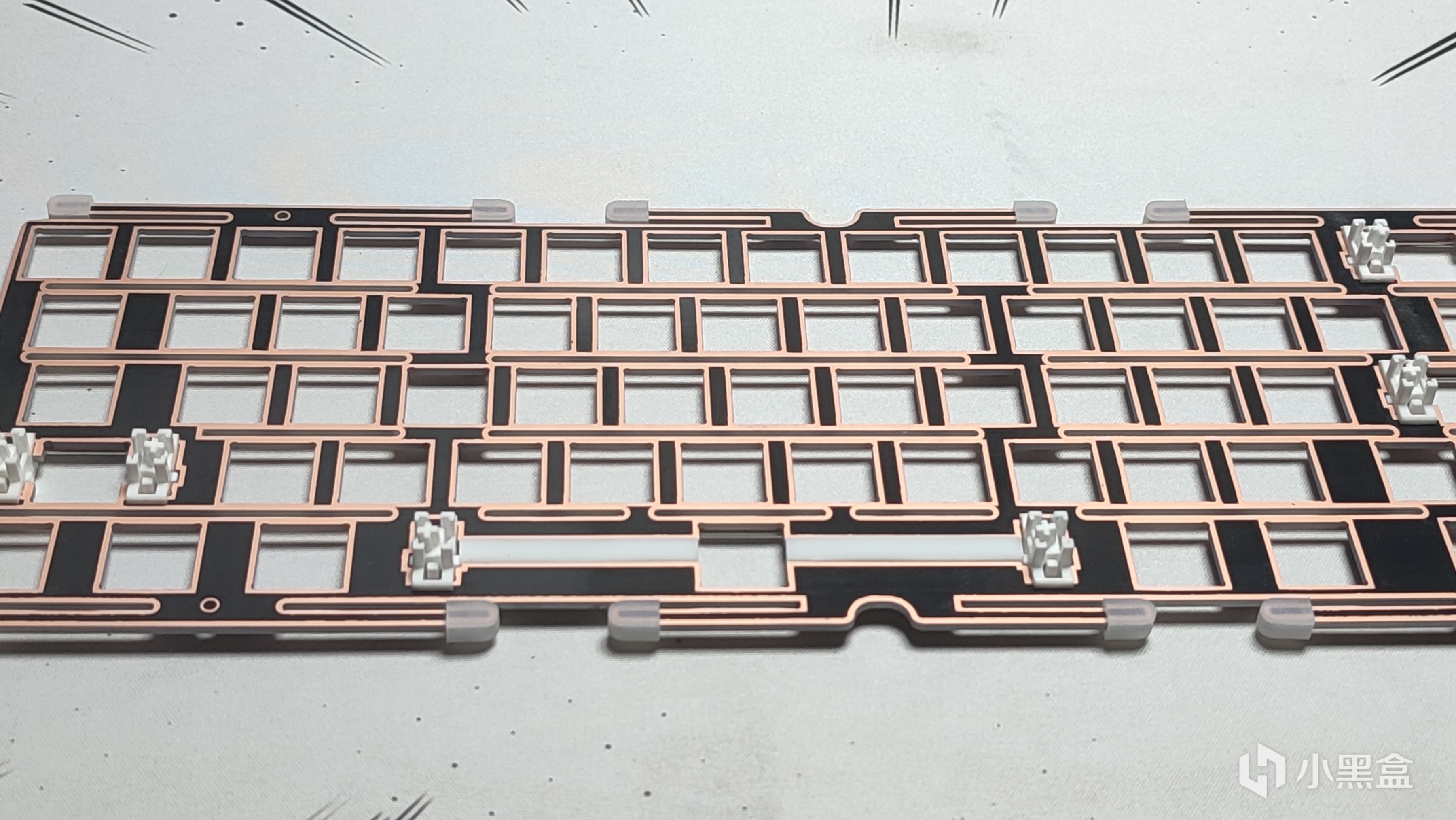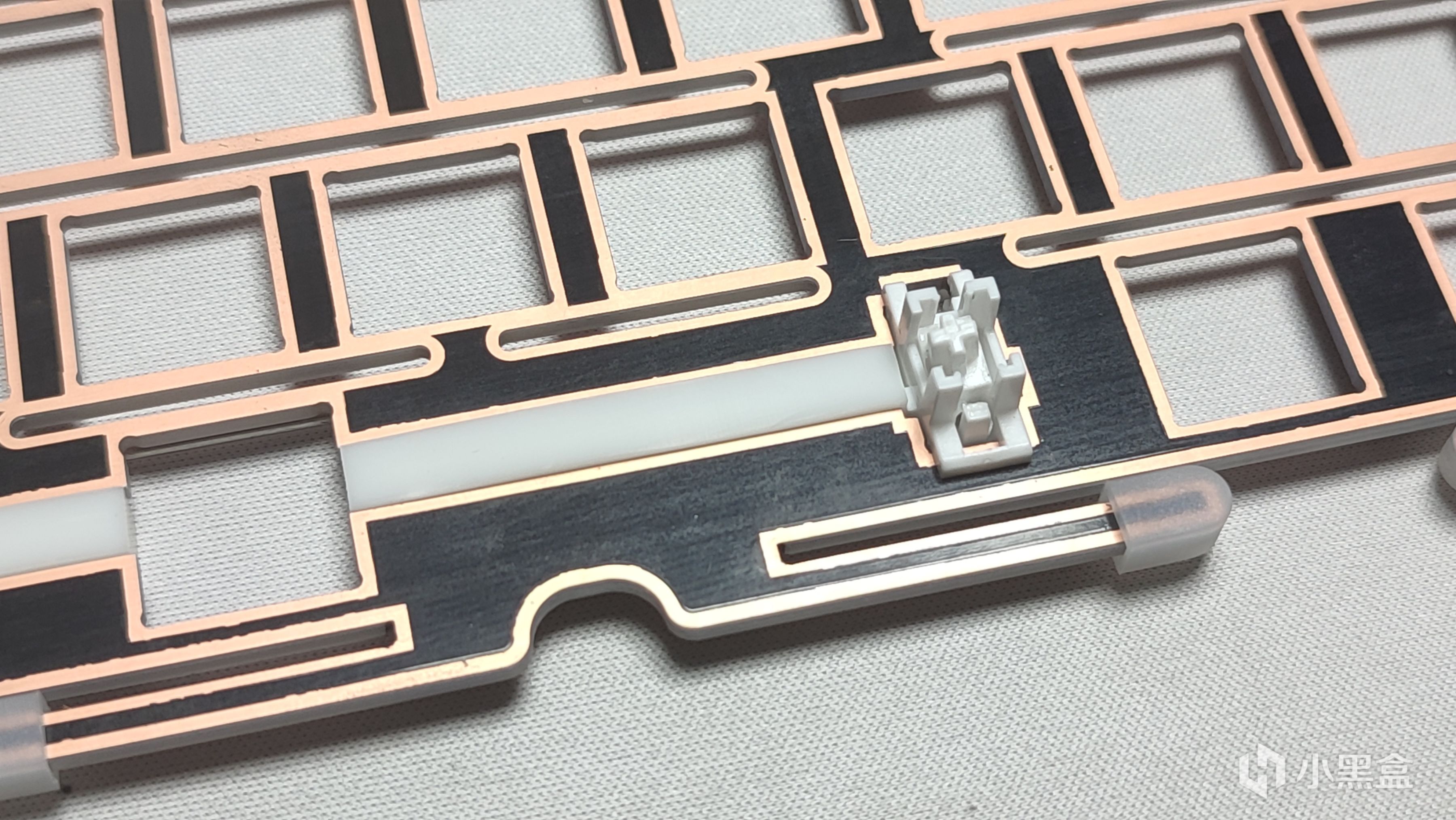 定位板我乍一看到其实是很眼熟,这一点看过我上一期铝坨坨套件的测评应该能看出来。定位板采用目前机械键盘中比较热门的FR4材质,相对于之前比较主流的PC来说手感上更脆硬,声音方面稍微脆响一些。整体采用横向开槽,对手感的一致性以及软弹性方面有所提升。同时可以看到开槽的位置都进行了镀铜处理,其他的不说,逼格上去了。