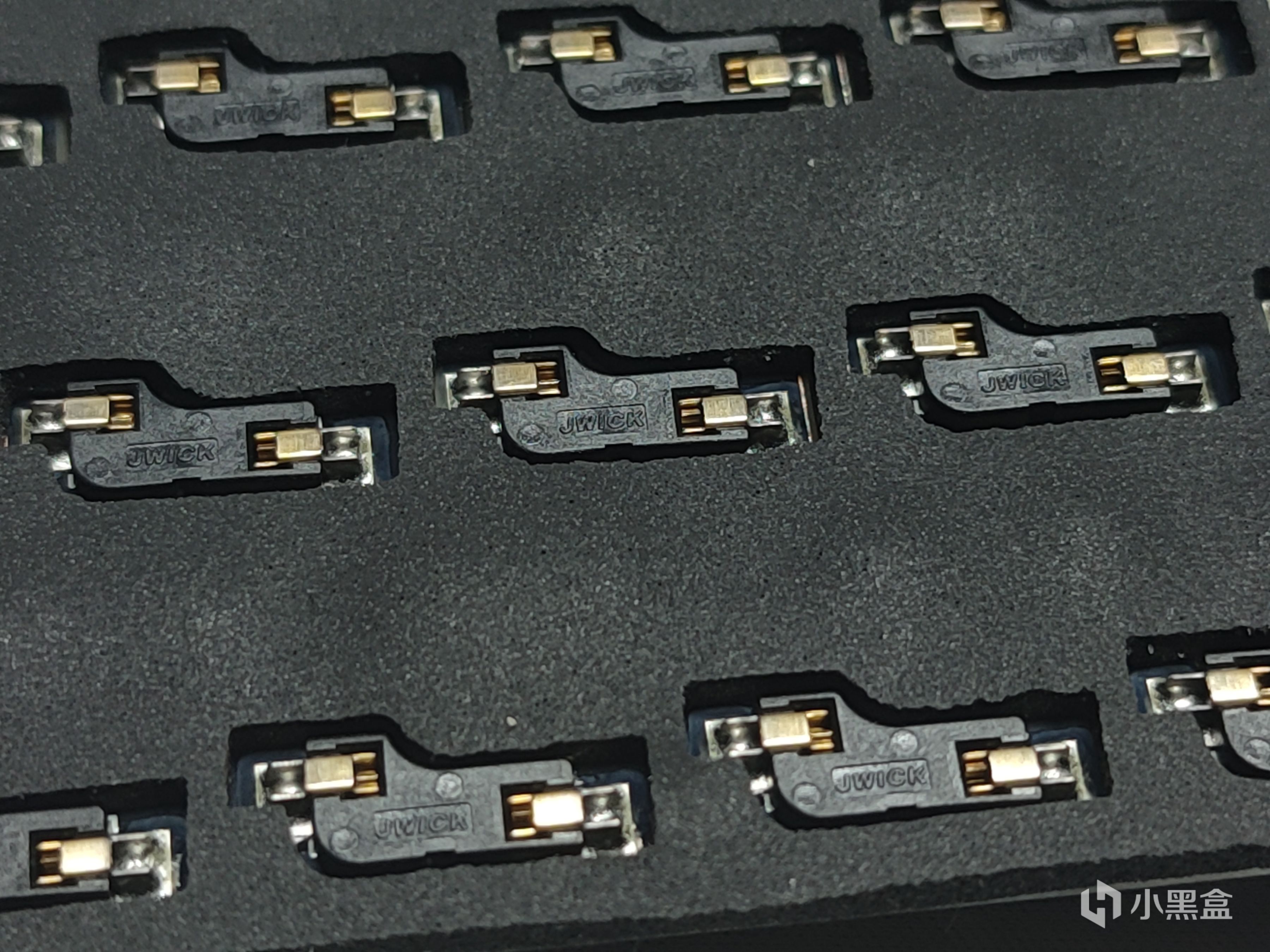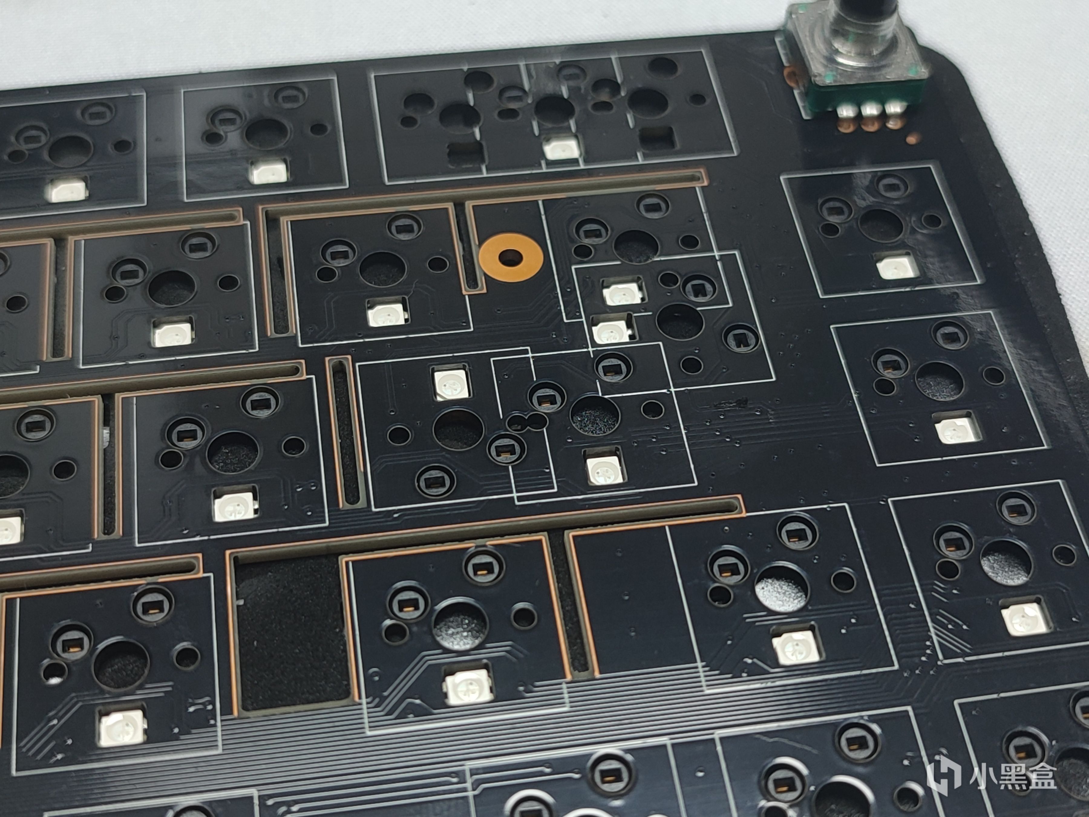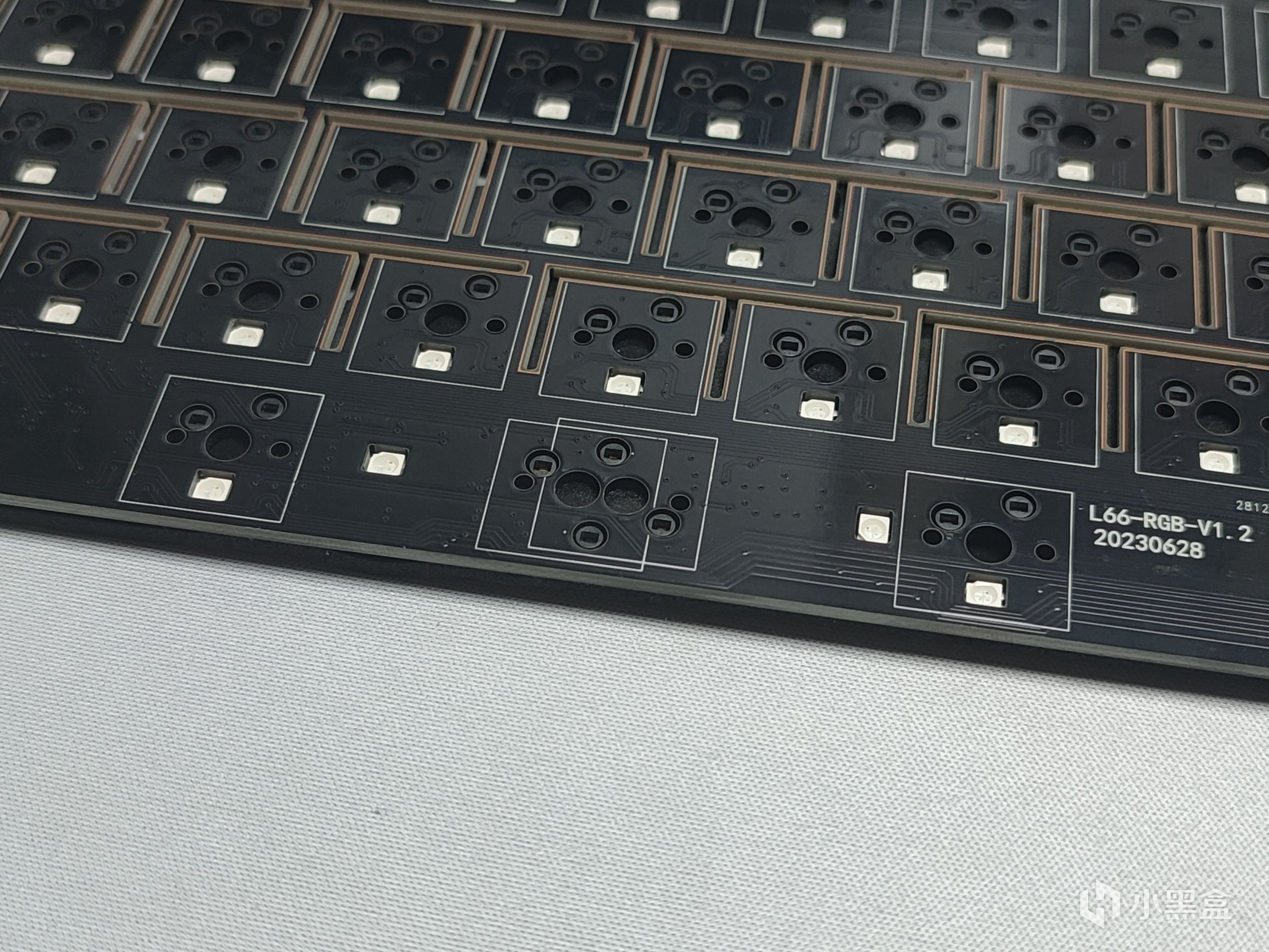 定位板我乍一看到其实是很眼熟,这一点看过我上一期铝坨坨套件的测评应该能看出来。定位板采用目前机械键盘中比较热门的FR4材质,相对于之前比较主流的PC来说手感上更脆硬,声音方面稍微脆响一些。整体采用横向开槽,对手感的一致性以及软弹性方面有所提升。同时可以看到开槽的位置都进行了镀铜处理,其他的不说,逼格上去了。