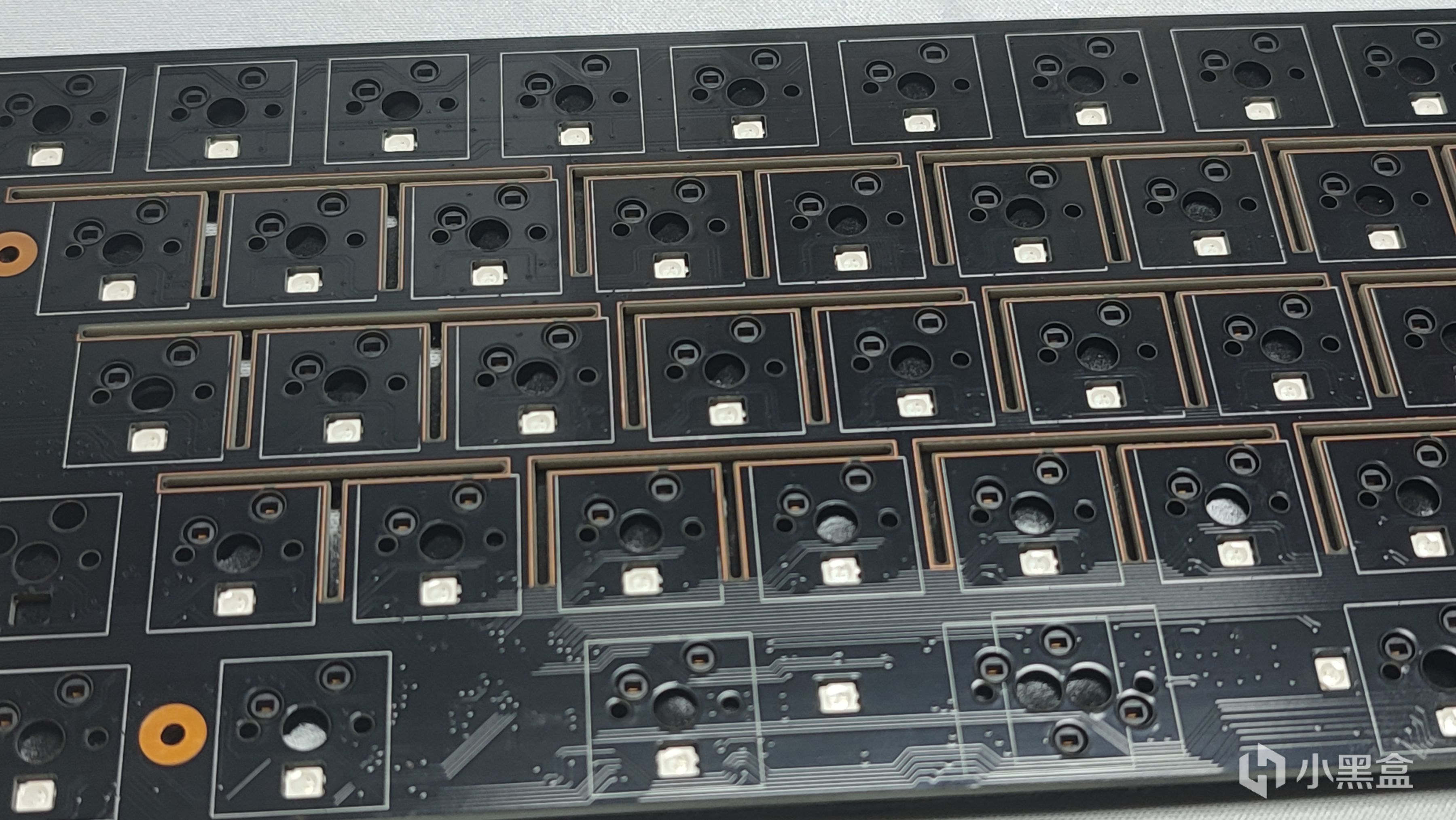 这个PCB有意思的点除了单键开槽之外还有一个很好玩的,可以看到回车部分以及空格处都有一些正常使用可能用不到的轴座位置,这个的好处在于如果定位板支持,可以在一定程度上更改键盘布局,比如说7字回车,以及分裂空格。