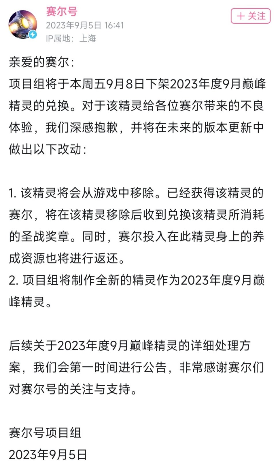 9月5日(今天),赛尔号官方宣布删除精灵“九青”并向玩家表达歉意。至此,事件暂时告一段落。