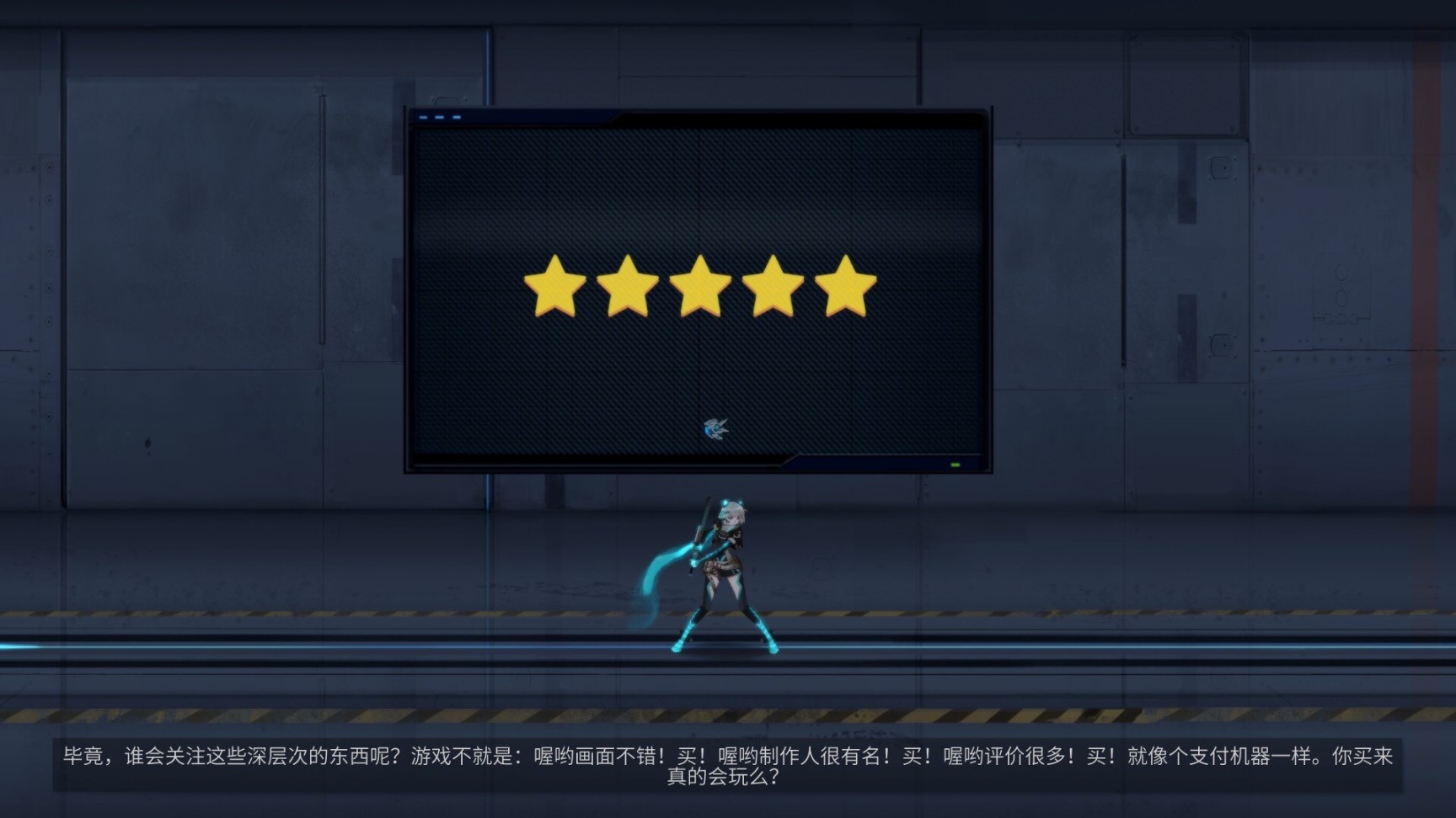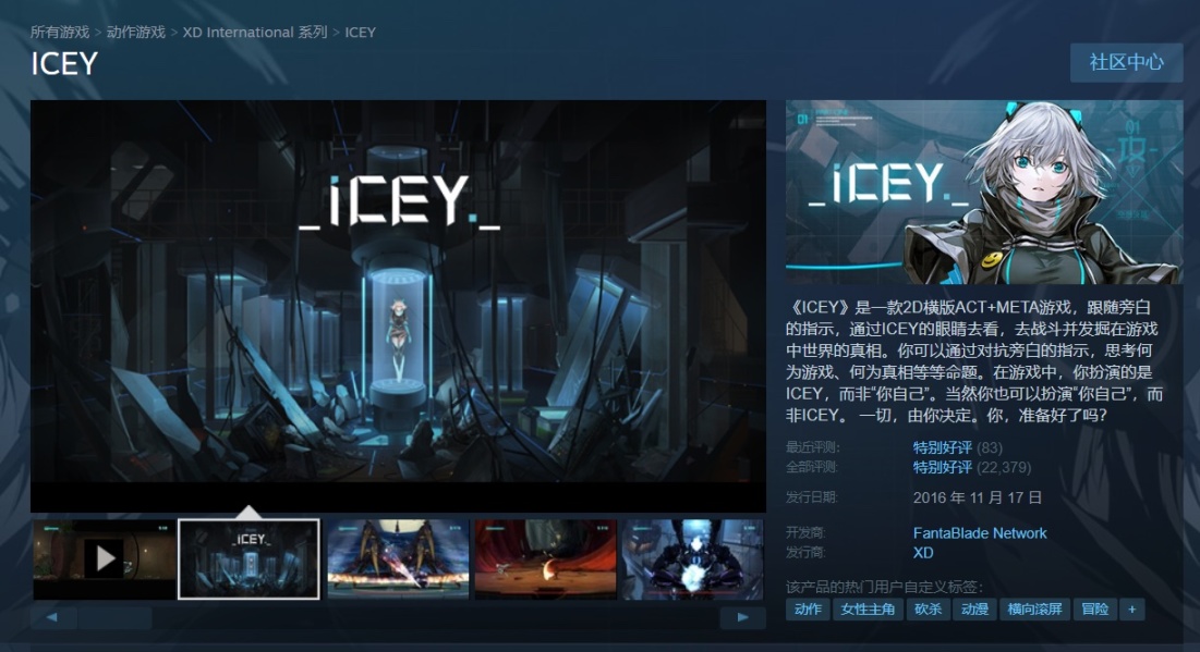有趣但实则并不深入的meta、有优有劣的act,怎么看似乎它都与“神作”并不沾边,相反则更靠近了“平庸”一词,当产生这样的想法后我看到了它的发布时间——2016年11月。好吧,当时我还是一名中学生。仔细想想,似乎没有哪款国产单机游戏过了近七年仍这么有生命力。即使用2023的眼光来看《ICEY》,它也仍可圈可点;放在2016年的国产游戏市场,它带给了当时玩家很新奇的体验,在2017年发布免费dlc并附带新剧情,厂商属实良心,如此看来也当得起“国产之光”的名号。
