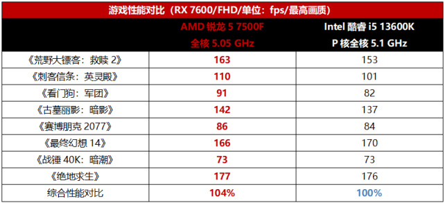 就算是锐龙5 7500F在默认频率下,其依然能在7款游戏中的性能表现超过了贵1000多元的酷睿i5 13600K,平均领先幅度为4%。可见,即便是在使用主流显卡的情况下,锐龙5 7500F依然相对酷睿i5 13600K有比较明显的游戏性能优势。