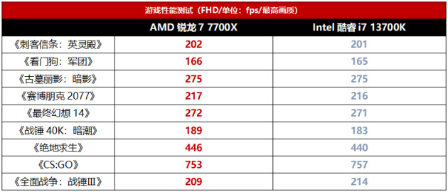 在9款主流游戏的测试中,锐龙7 7700X的性能表现有6款胜出,1款打平,总的来说是领先酷睿i7 13700K了。不仅仅是性能上的领先,而且锐龙7 7700X的TDP仅有105W,而酷睿i7 13700K满血输出的PL2状态TDP已经达到了253W,能效比方面显然是锐龙7 7700X遥遥领先,更低的功率也就意味着它在电源、主板和散热器的搭配方面要求更加宽松,装机成本方面优势更明显。