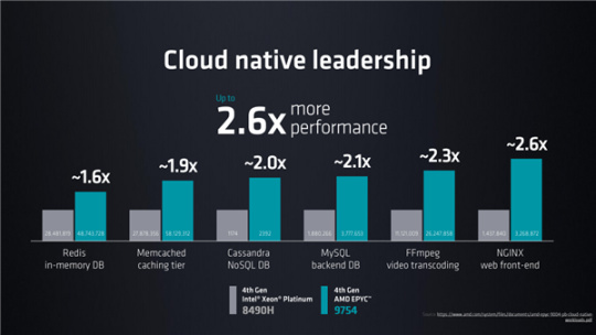 128核心的Bergamo EPYC 9754在雲原生應用中,更是近乎蹂躪至強鉑金8490H,性能優勢更是最高達到驚人的2.6倍。