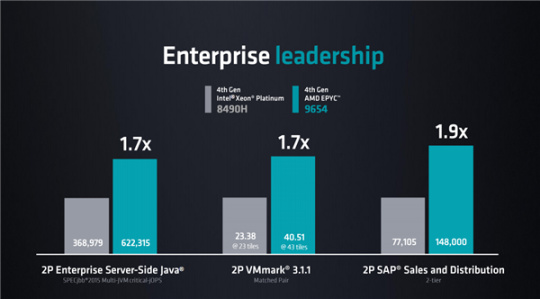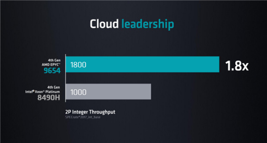 根據官方數據,96核心的旗艦Genoa EPYC 9654對比60核心的競品旗艦至強鉑金8490H,無論是SPECrate2017_int爲代表的雲服務應用中,還是Java、VMmark、SAP等企業級應用中,性能差異都達到了1.8倍左右,可以說直接甩開了一個身位,根本不給追趕的空間。