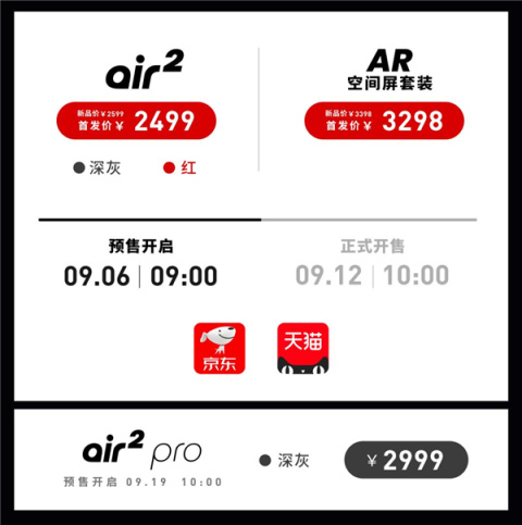 XREAL Air 2 Pro售价2999元,将于9月19日10:00在京东、天猫平台同步开启预售,正式开售时间敬请期待。
