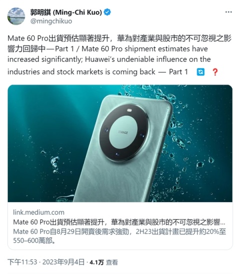 快科技9月6日消息,知名爆料人郭明錤最近发文,预测华为Mate 60 Pro在发售12个月后的累积出货量,预期至少将达到1200万台,2024年华为手机的出货量预计6000万台。