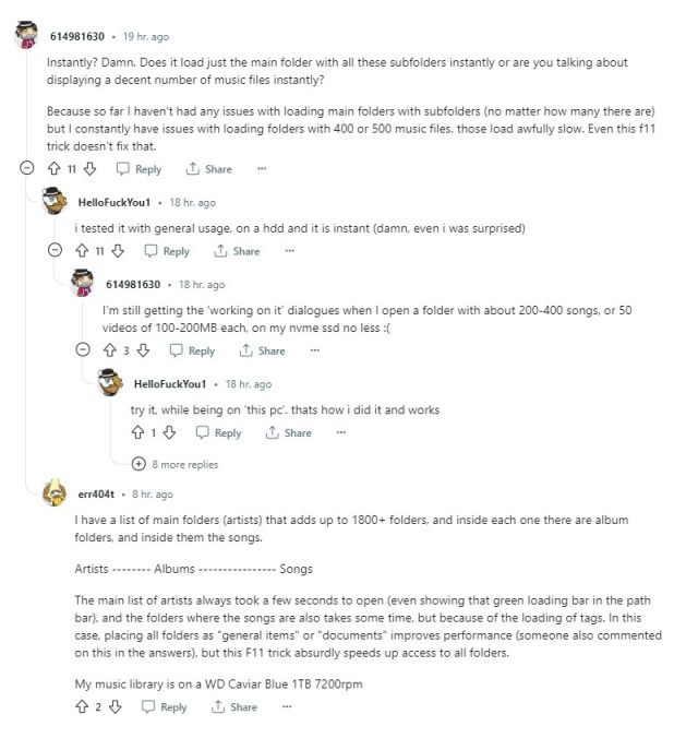 他表示操作步骤如下:打开文件资源管理器,按下 F11 切换到全屏模式,然后再按下 F11 按键退出全屏模式。他表示这种方式操作之后,可以明显缩短文件夹内生成缩略图的时间,并表示搜索功能在这种操作之后,也更加灵敏和快捷。