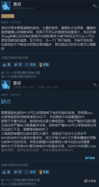 同時,查看多數評價能發現,仍有不少玩家針對遊戲有過多讀取場景,需要非常強勁的性能PC,以及有不少Bug 與遊戲優化問題等。