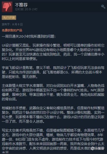 給予差評的玩家則認爲,任務過多且形式單調,NPC 演出表情生硬,UI 設計與太空旅行未符合原先期待等等。
