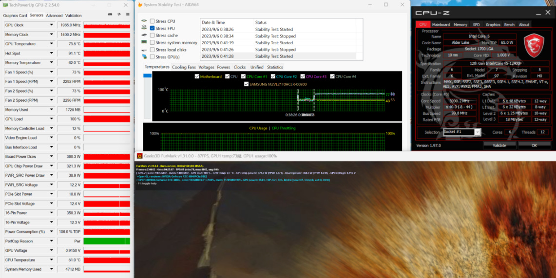 CPU、GPU雙烤20多分鐘,顯卡滿載功耗340W左右,溫度73.8℃,CPU滿載功耗80W左右,溫度81℃,CPU溫度稍微有點高,可能是我硅脂塗少了。