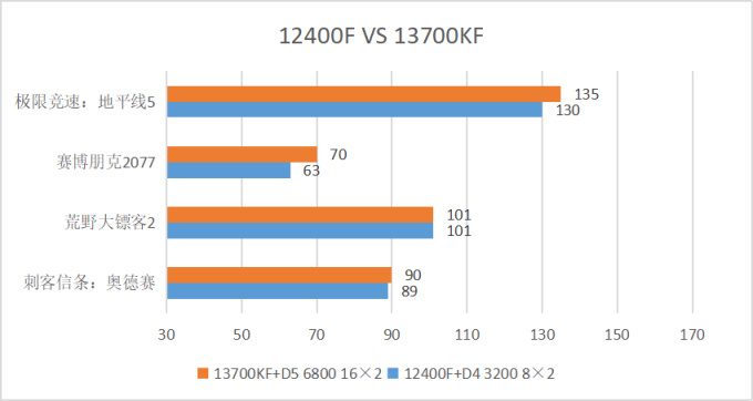 差距最大的賽博朋克有10%左右,奧德賽和大鏢客2幀數差不多,平均下來,13700KF+6800 16×2比12400F+3200 8×2提升了3~4%