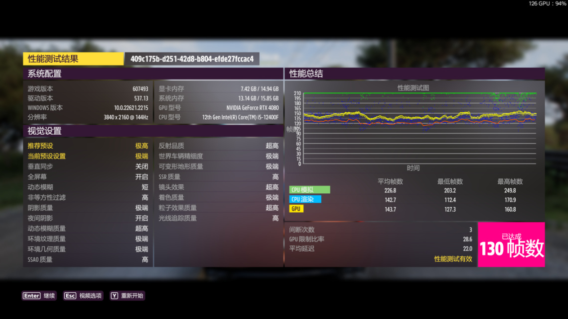 極限競速:地平線5 4K分辨率預設極端畫質,平均幀數130幀
