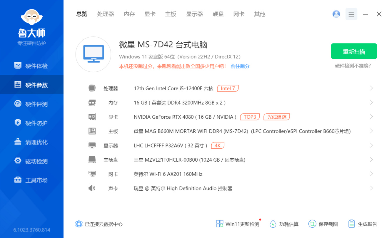 整機價格10000來塊,這套配置只有機箱和顯卡是新入手的,其他硬件都是舊電腦拆下來了,顯卡鹹魚同城7200買的,其餘硬件價格按照現在的行情加一塊也就3000塊左右,電源可以選擇更大的,估計很多人會覺得650W電源小了,我之前用這個電源帶的13600KF+3070Ti名人堂(310W),4080功耗是340W,CPU從13600KF降成了12400F,還有就是振華LG電源設計餘量比其他品牌的電源要高,所以振華LG650帶這配置肯定是沒問題的,但是預算夠還是建議電源按照NVIDIA官方推薦功率(850W)買。