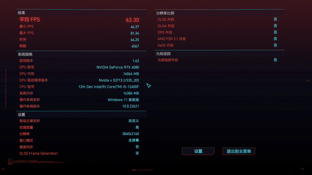 賽博朋克2077 4K分辨率預設超級畫質,平均幀數63幀
