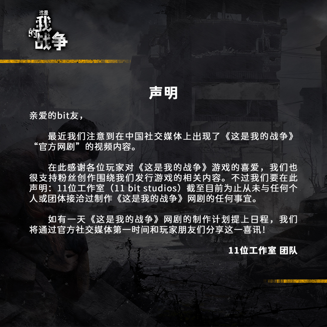 在此感谢各位玩家对《这是我的战争》游戏的喜爱,我们也很支持粉丝创作围绕我们发行游戏的相关内容。不过我们要在此声明:11位工作室(11 bit studios)截至目前为止从未与任何个人或团体接洽过制作《这是我的战争》网剧的任何事宜。