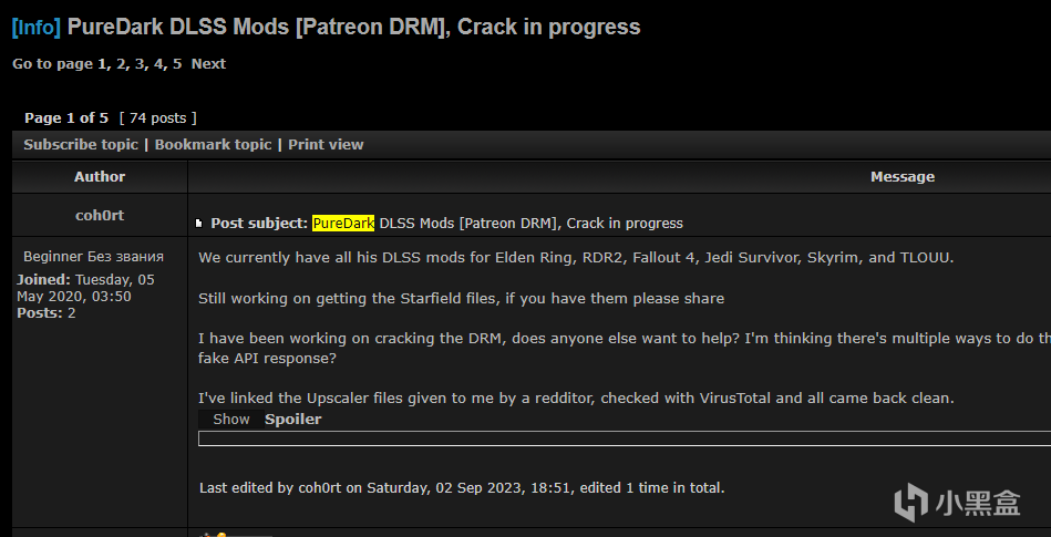 在PureDark发布付费MOD后,知名破解网站CS.RIN上有用户发帖,表示正在破解PureDark DLSS Mod的DRM加密。
