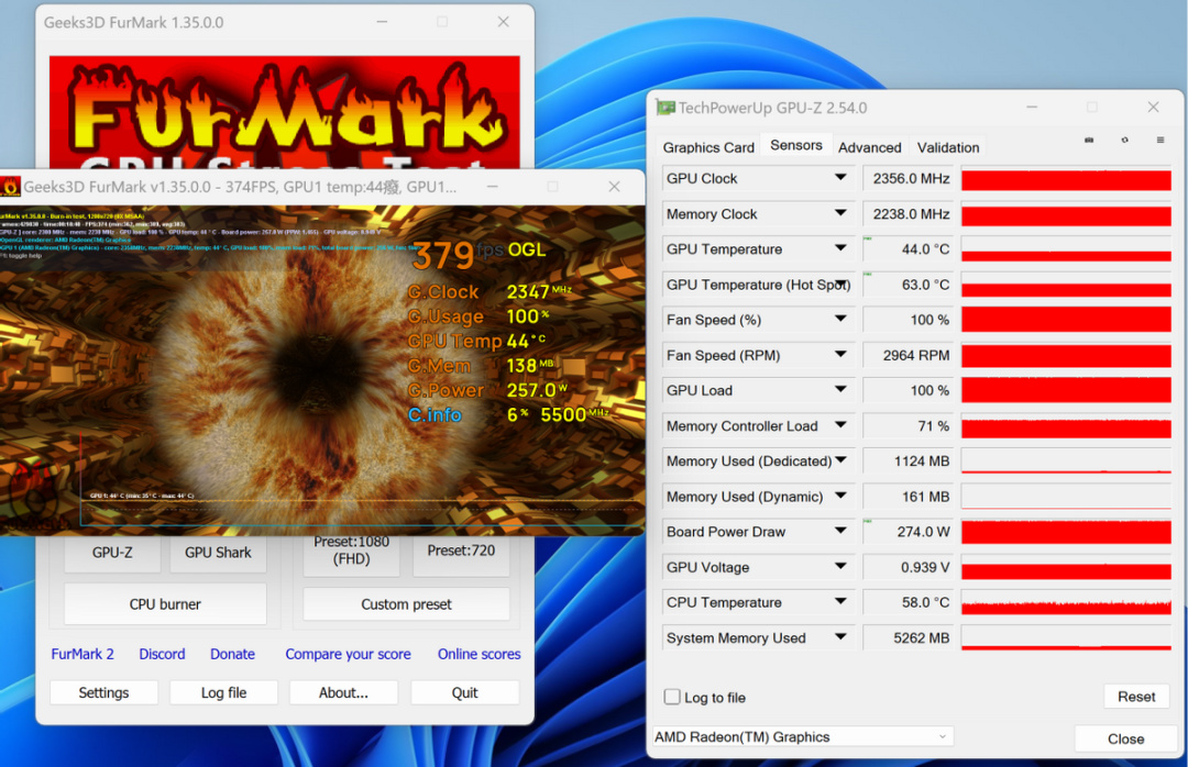 由于GPU核心采用了5nm + 6nm工艺制造,再加上华硕TUF-RX7700XT-O12G-GAMING自带的高规格散热器,我们对其散热表现相当期待。通过FurMark半小时以上的考机测试,显卡的核心频率最高达到2356MHz(在运行Time Spy测试时,GPU的最高频率达到了2627MHz),此时GPU的温度只有44℃,热点温度61℃,可以说是凉快到令人惊讶。