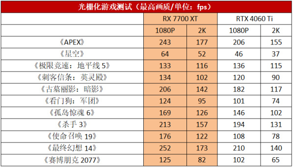 光栅化性能部分,我们选择了11款游戏进行测试,基本上涵盖了当前热门的游戏类型,可以相对准确地反映出华硕TUF-RX7700XT-O12G-GAMING显卡在实际游戏中的性能水平。