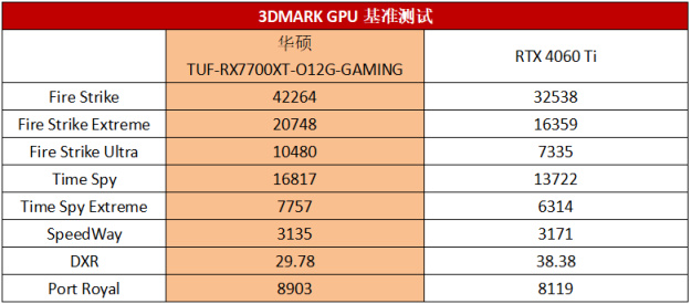 从整个基准测试的成绩来看,无论是DX11、DX12还是光追等各个测试项目中,华硕TUF-RX7700XT-O12G-GAMING的表现明显优于RTX 4060 Ti。