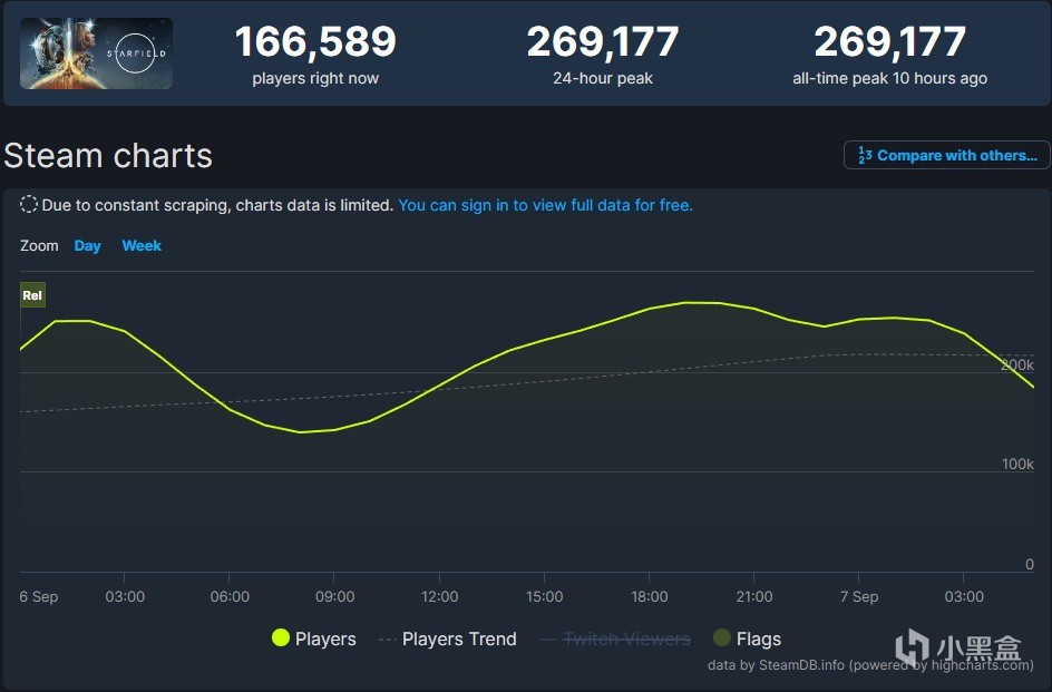 据SteamDB数据显示,《星空》Steam在线玩家已再创新高,同时在线人数峰值为269177人。《星空》Steam总评仍为“特别好评”,好评率为84%。