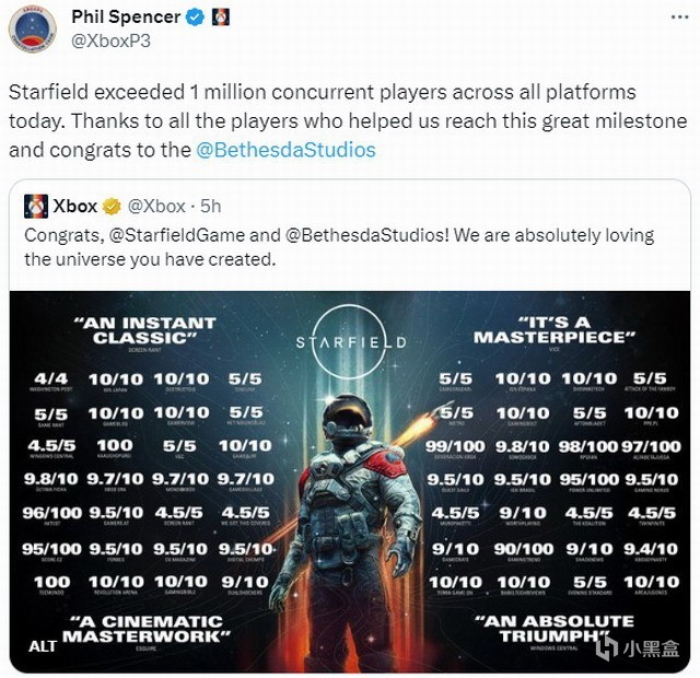 B社旗下大作《星空》已正式发售,今日(9月7日)Xbox负责人菲尔·斯宾塞(Phil Spencer)发推文宣布,《星空》全平台同时在线玩家数量已超过100万,感谢所有帮助他们达到这一伟大里程碑的玩家,也祝贺B社做出了优秀作品。