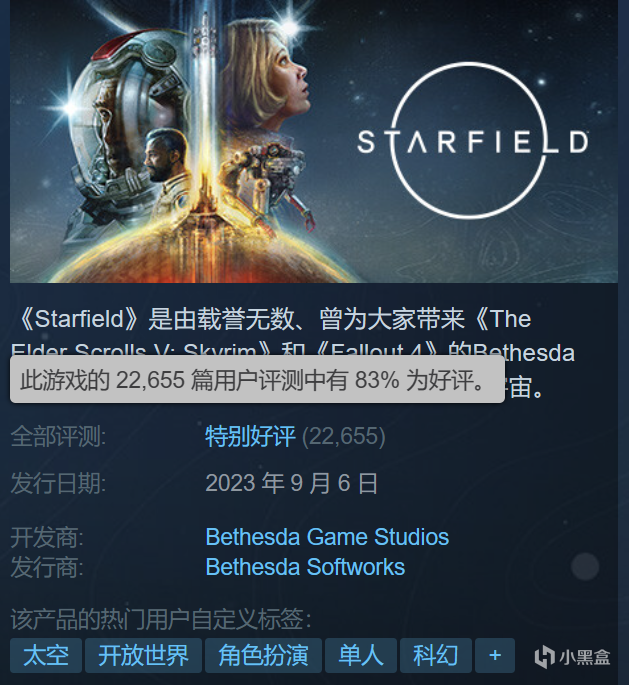 Steam平台上,《星空》目前的评论数已经超过2万评论,显示“特别好评”,高达83%玩家给予好评。