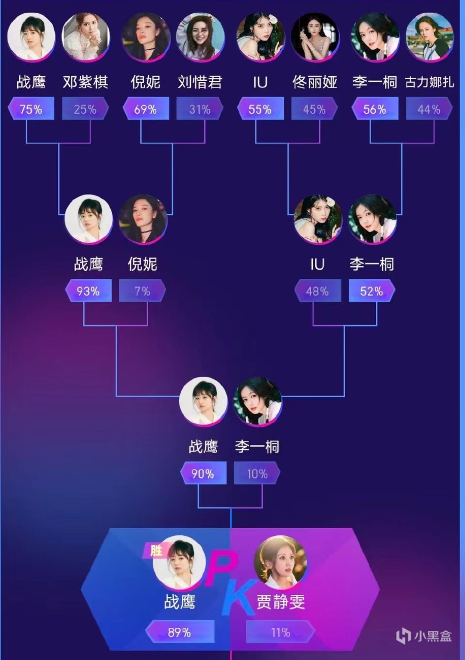 8进4中,战鹰对决李一桐,得票率91%,直接进入四强!四强对决往届女神贾静雯,成功挺进决赛!